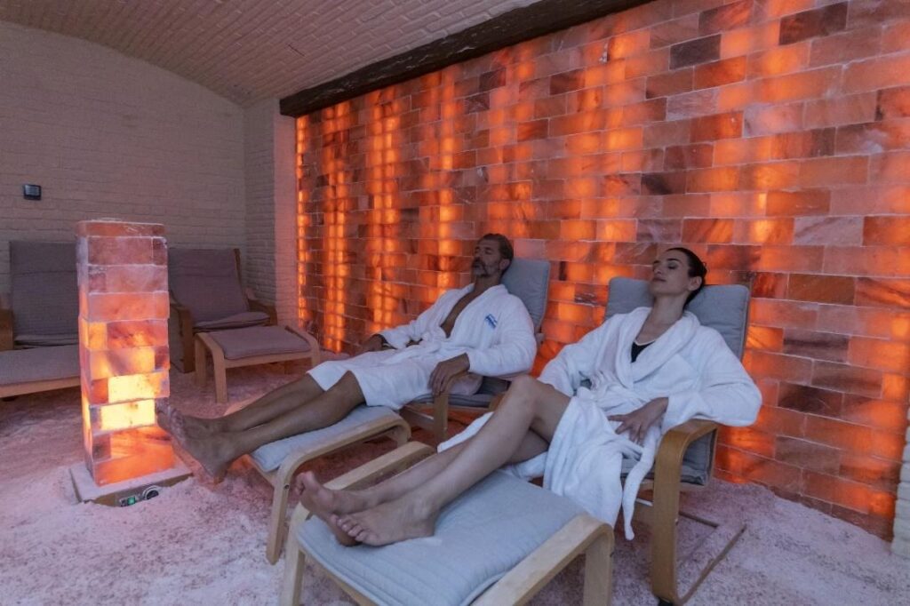 - Haloterapia. El efecto de la haloterapia también es notable: en nuestra cámara de sal, el ambiente seco y salino limpia tus vías respiratorias, trata tu piel y produce un efecto ansiolítico inmediato. Respirar ese aire mineralizado te aporta calma y, en consecuencia, favorece un sueño más profundo.